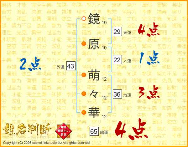 鏡(19画)原(10画) 萌(12画)々(12画)華(12画)