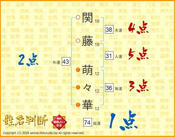 関(19画)藤(19画) 萌(12画)々(12画)華(12画)