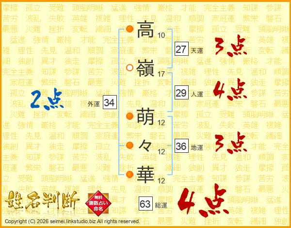高(10画)嶺(17画) 萌(12画)々(12画)華(12画)