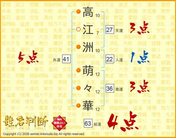 高(10画)江(7画)洲(10画) 萌(12画)々(12画)華(12画)