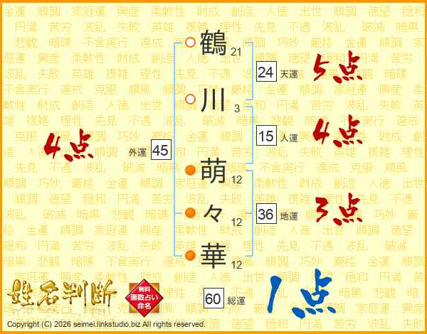 鶴(21画)川(3画) 萌(12画)々(12画)華(12画)