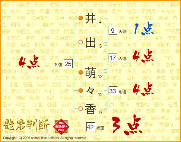 井(4画)出(5画) 萌(12画)々(12画)香(9画)