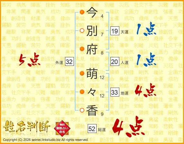 今(4画)別(7画)府(8画) 萌(12画)々(12画)香(9画)