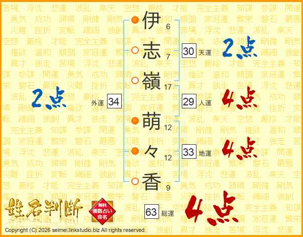 伊(6画)志(7画)嶺(17画) 萌(12画)々(12画)香(9画)