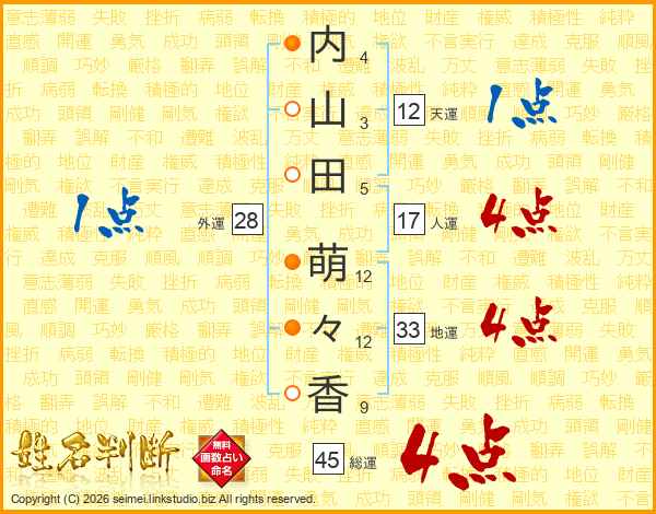 内(4画)山(3画)田(5画) 萌(12画)々(12画)香(9画)