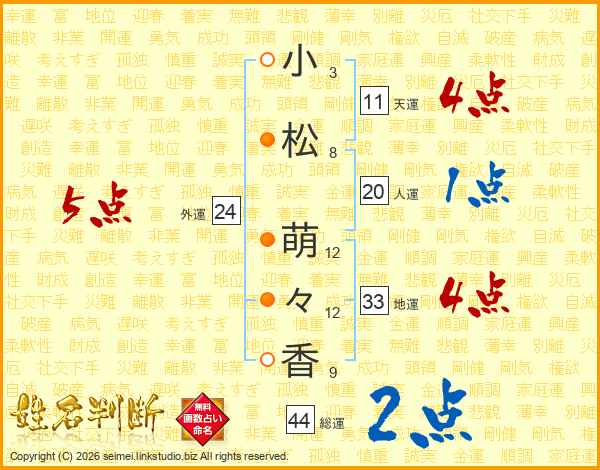 小(3画)松(8画) 萌(12画)々(12画)香(9画)