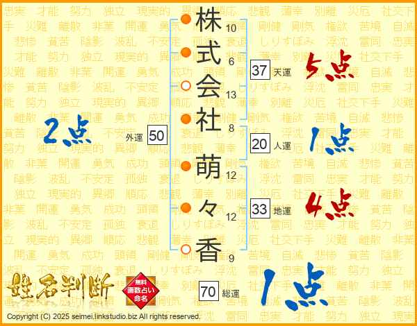 株(10画)式(6画)会(13画)社(8画) 萌(12画)々(12画)香(9画)