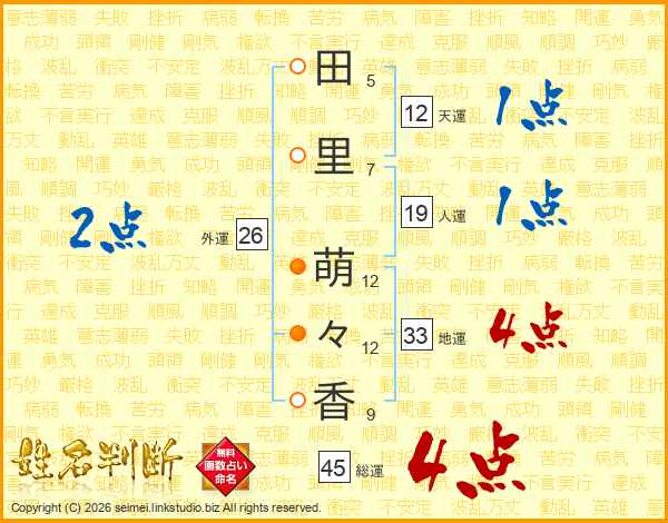 田(5画)里(7画) 萌(12画)々(12画)香(9画)