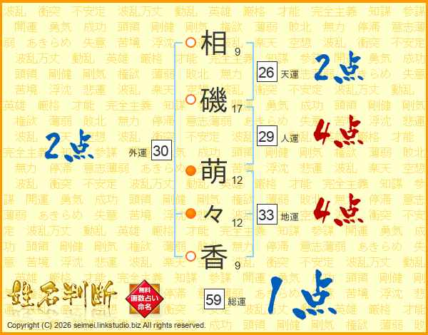 相(9画)磯(17画)  萌(12画)々(12画)香(9画)
