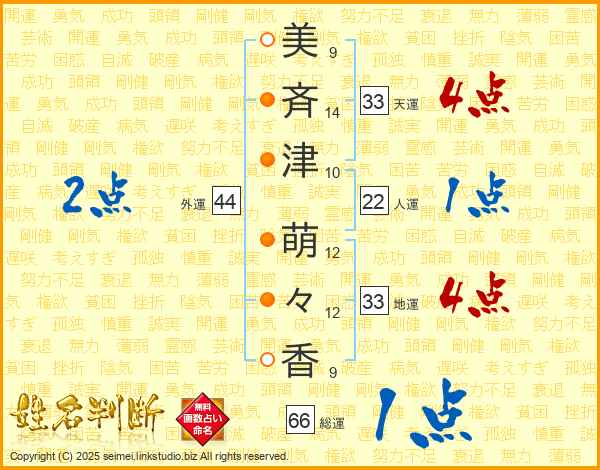 美(9画)斉(14画)津(10画) 萌(12画)々(12画)香(9画)