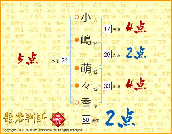 小(3画)嶋(14画) 萌(12画)々(12画)香(9画)