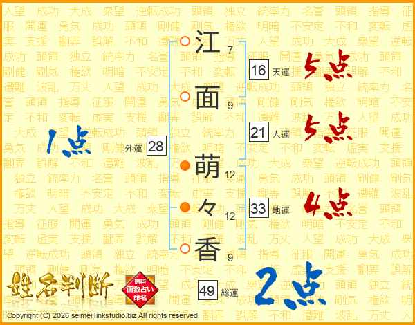 江(7画)面(9画) 萌(12画)々(12画)香(9画)