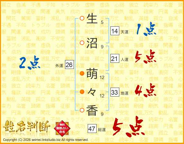 生(5画)沼(9画) 萌(12画)々(12画)香(9画)