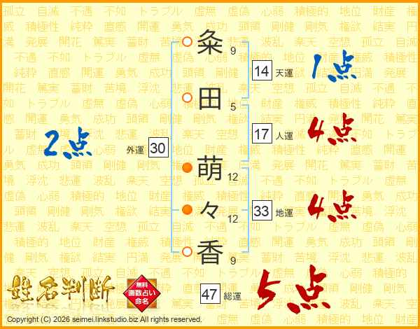 粂(9画)田(5画) 萌(12画)々(12画)香(9画)