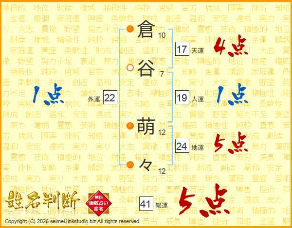 倉(10画)谷(7画) 萌(12画)々(12画)