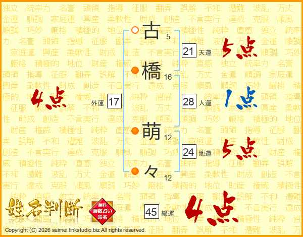 古(5画)橋(16画) 萌(12画)々(12画)