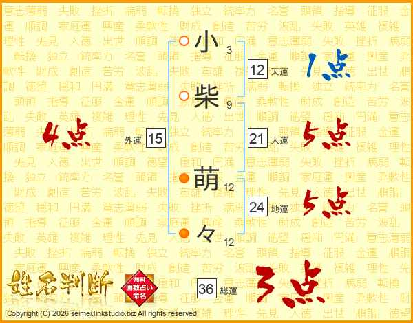 小(3画)柴(9画) 萌(12画)々(12画)