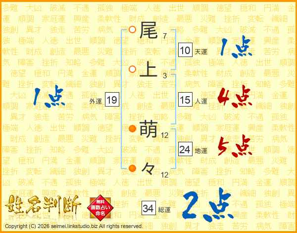 尾(7画)上(3画) 萌(12画)々(12画)