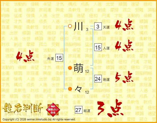 川(3画) 萌(12画)々(12画)