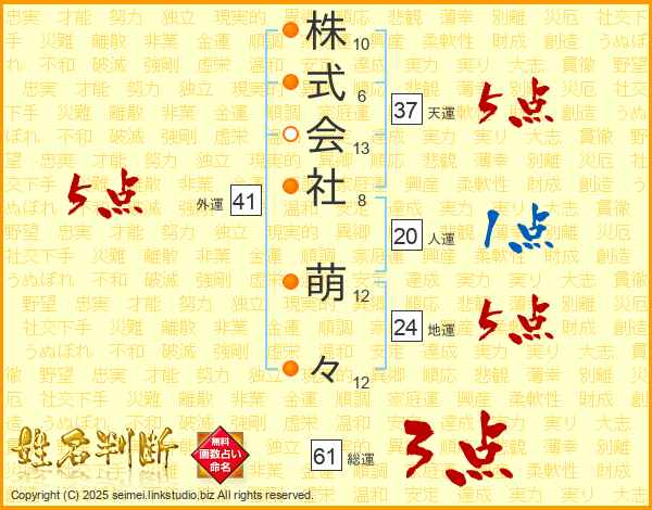 株(10画)式(6画)会(13画)社(8画) 萌(12画)々(12画)