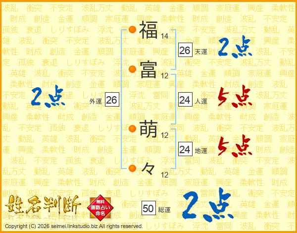 生活面を象徴する運勢です。外部から受ける影響力を表し、結婚運、家庭運や職場、環境への順応性を表します。総運から人運を引いた画数。姓や名が1文字の場合を除く。