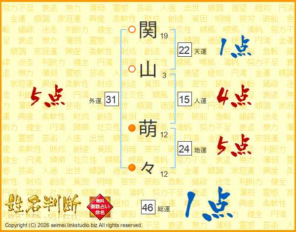 生活面を象徴する運勢です。外部から受ける影響力を表し、結婚運、家庭運や職場、環境への順応性を表します。総運から人運を引いた画数。姓や名が1文字の場合を除く。