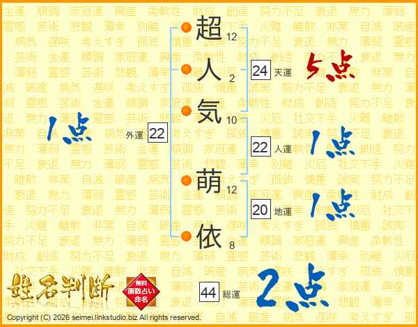超(12画)人(2画)気(10画) 萌(12画)依(8画)