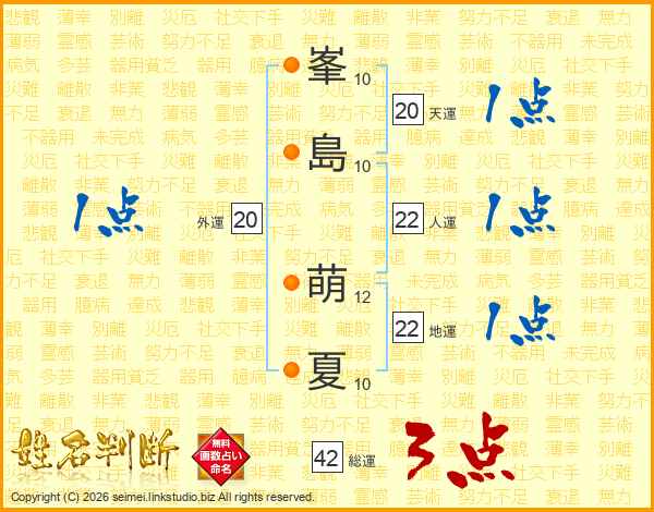 峯(10画)島(10画) 萌(12画)夏(10画)