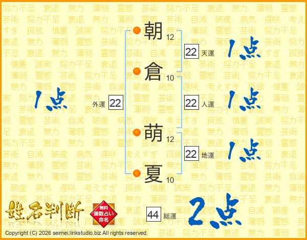 朝倉萌夏さんの総運は44画の2点!