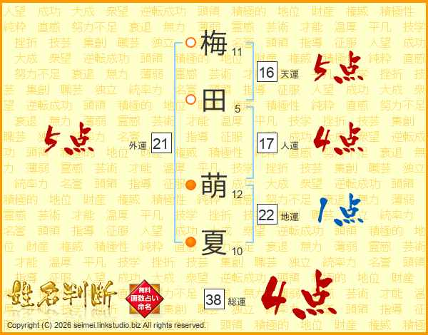 梅(11画)田(5画) 萌(12画)夏(10画)