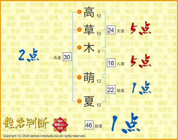 高(10画)草(10画)木(4画) 萌(12画)夏(10画)