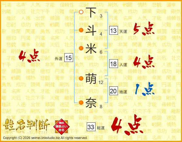 下(3画)斗(4画)米(6画) 萌(12画)奈(8画)
