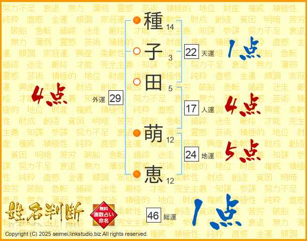 種(14画)子(3画)田(5画) 萌(12画)恵(12画)