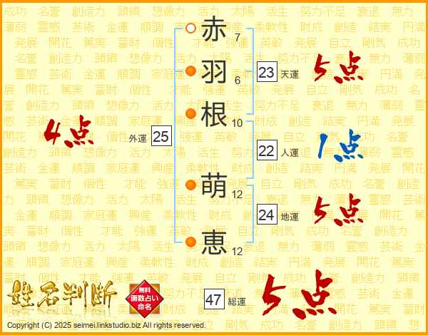 赤(7画)羽(6画)根(10画) 萌(12画)恵(12画)
