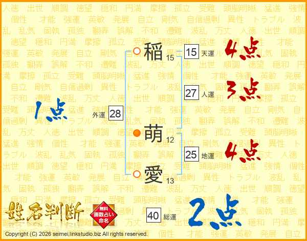 生活面を象徴する運勢です。外部から受ける影響力を表し、結婚運、家庭運や職場、環境への順応性を表します。総運から人運を引いた画数。姓や名が1文字の場合を除く。