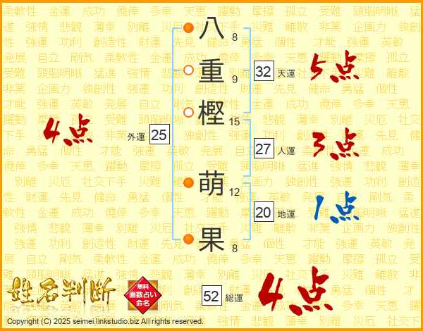 八(8画)重(9画)樫(15画) 萌(12画)果(8画)
