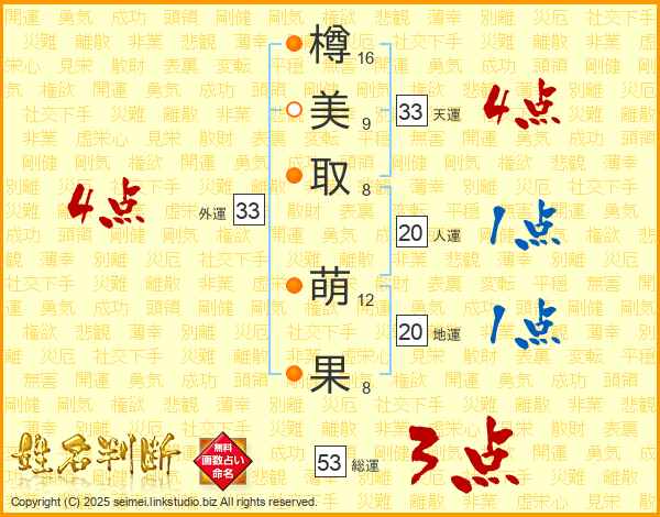 樽(16画)美(9画)取(8画) 萌(12画)果(8画)