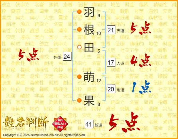 羽(6画)根(10画)田(5画) 萌(12画)果(8画)