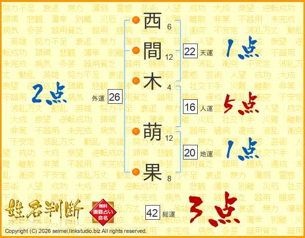西(6画)間(12画)木(4画) 萌(12画)果(8画)
