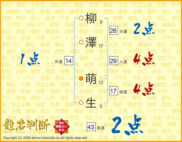 柳(9画)澤(17画) 萌(12画)生(5画)