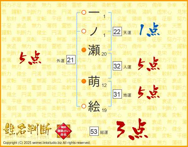 一(1画)ノ(1画)瀬(20画) 萌(12画)絵(19画)