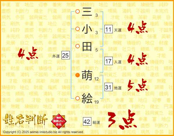 三(3画)小(3画)田(5画) 萌(12画)絵(19画)