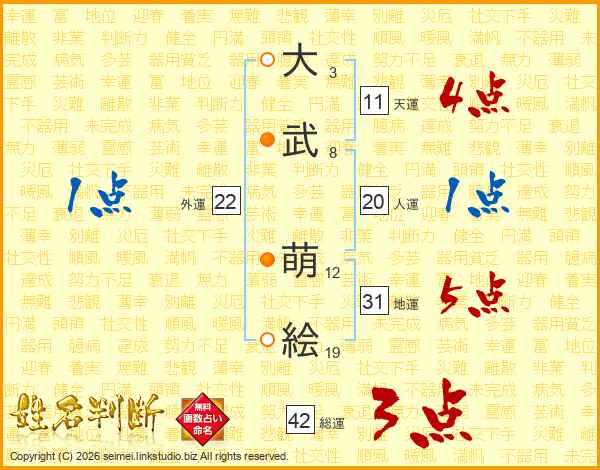 大(3画)武(8画) 萌(12画)絵(19画)