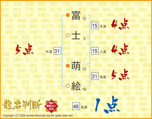 生活面を象徴する運勢です。外部から受ける影響力を表し、結婚運、家庭運や職場、環境への順応性を表します。総運から人運を引いた画数。姓や名が1文字の場合を除く。