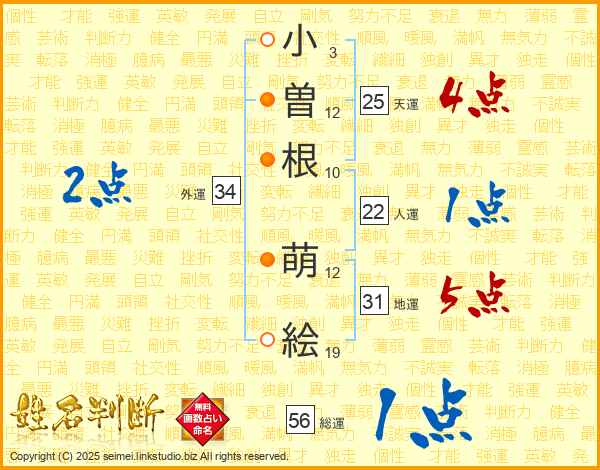 小(3画)曽(12画)根(10画) 萌(12画)絵(19画)