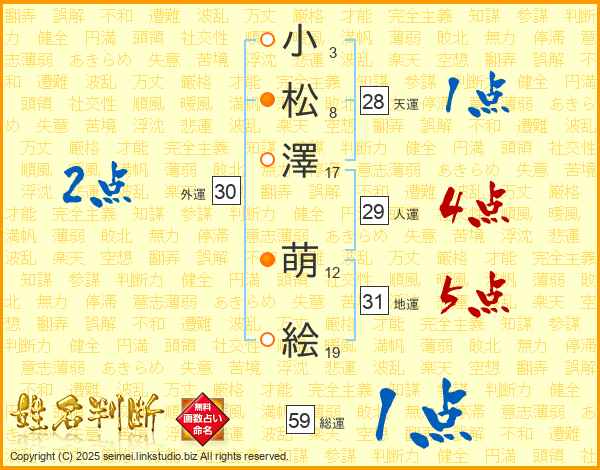 小(3画)松(8画)澤(17画) 萌(12画)絵(19画)