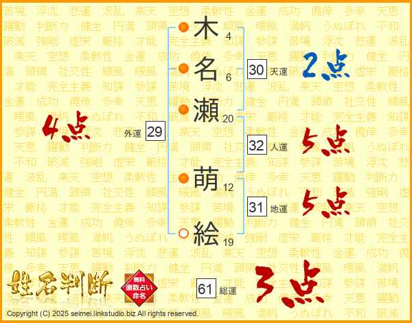 木(4画)名(6画)瀬(20画) 萌(12画)絵(19画)