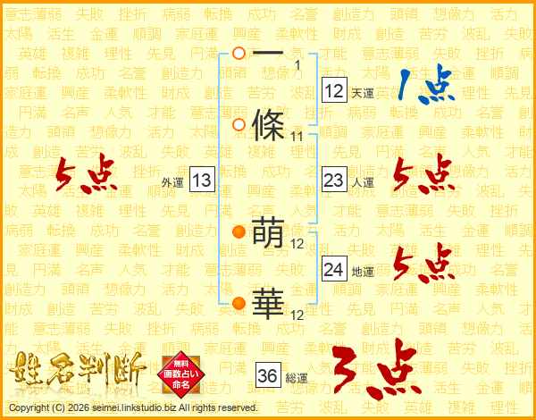 あなたの人生を表す1番重要な運勢です。生涯を通じて影響する総合運となり、主に50歳以降の晩年期に影響を及ぼします。苗字と名前の合計画数。