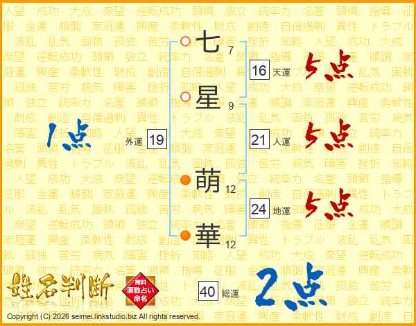 生活面を象徴する運勢です。外部から受ける影響力を表し、結婚運、家庭運や職場、環境への順応性を表します。総運から人運を引いた画数。姓や名が1文字の場合を除く。