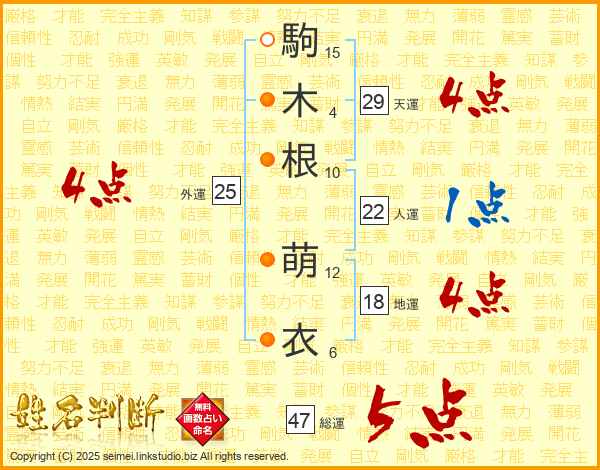 駒(15画)木(4画)根(10画) 萌(12画)衣(6画)